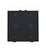 Met deze drukknop dim je twee lichtpunten of lichtkringen. Hij wordt via een klikmechanisme op de muurprint bevestigd. Een led geeft aan of het licht op- of neergedimd is. Mechanisme inclusief toets. Kleur: Black steel.